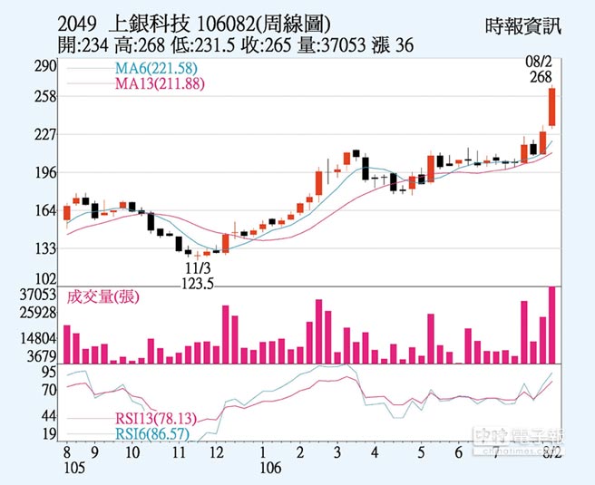 上銀(2049)第2季認(rèn)列匯兌收益1.3億元,EPS達(dá)2.58元,創(chuàng)近10季新高。法人預(yù)期第3季新臺(tái)幣匯率不再升值,第3季毛利率將優(yōu)于第2季,外資券商預(yù)估,今年EPS比去年增加2%~3%,上周五收盤價(jià)265元,逆勢(shì)大漲18.5元,股價(jià)創(chuàng)2015年4月以來(lái)新高,周漲幅15.72%。