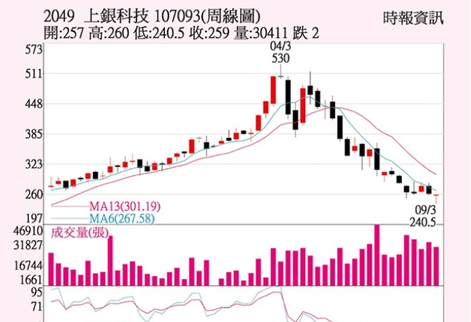 上銀科技(hiwin)晶圓移載模組通過SEMI S2設(shè)備安全衛(wèi)生環(huán)?;鶞?zhǔn)認(rèn)證,有助于上銀晶圓機(jī)器人取得半導(dǎo)體設(shè)備業(yè)訂單,今年?duì)I收獲利均攀史上新高,使得上銀股價(jià)跌破上市后第1次開辦現(xiàn)金增資承銷價(jià)250元后,外資開始轉(zhuǎn)賣為買,上周五大漲16.5元,收259.0元,重新收復(fù)周線反壓套牢區(qū)。單周股價(jià)跌幅0.77%。