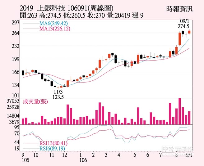 上銀科技(2049)直線導軌及滾珠螺桿等關鍵零組件明年首季訂單滿載,大陸蘇州新廠延后完工加入量產行列,產能吃緊。法人預期,上銀第3季合并營收年增2成多,EPS上看2.6元,全年EPS挑戰8.5元以上。上周五股價上漲2.5元,收270.0元,周漲幅3.45%。