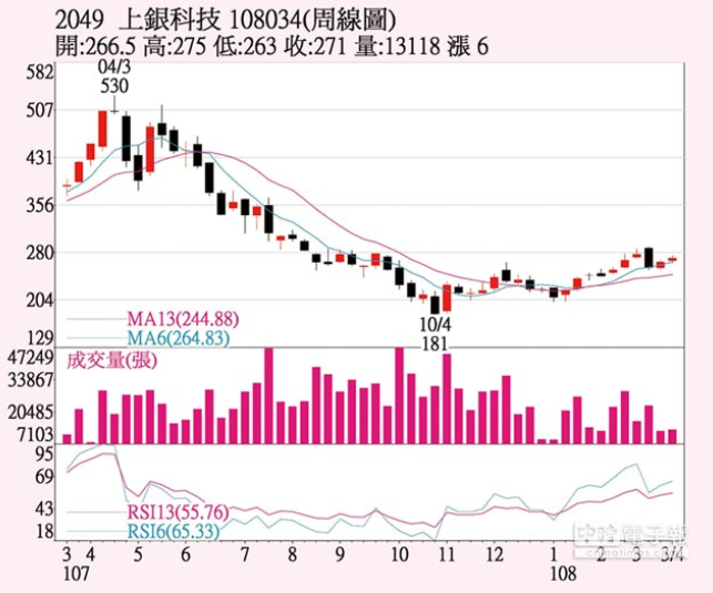 上銀科技前二月合并營(yíng)收雖年減23.96%,隨著工具機(jī)產(chǎn)業(yè)景氣可望3、4月落底,最慢5月回升,第二季營(yíng)運(yùn)比第一季好,逐季好轉(zhuǎn),布局半導(dǎo)體、電子及汽車產(chǎn)業(yè)亦有斬獲,上周五外資及自營(yíng)商連手賣超560張,終場(chǎng)平盤(pán)271元作收,站穩(wěn)周、月及季線,周漲幅2.26%。