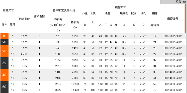 注:螺帽剛性 - 如下表所示之剛性質是施加30%之動負荷(Ca)為軸向負荷時,溝槽與鋼珠間所產生的彈性變形而求得之理論值。