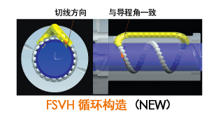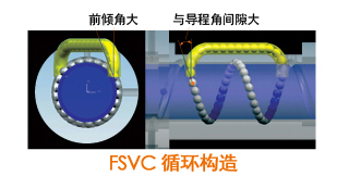 PMI 采用之循環構造可使螺帽內之負荷分布均勻,提高滾珠絲桿之使用壽命。 舊型式(FSVC)之循環方式為回流管垂直插入滾珠溝槽形成一前傾角,滾珠在進入回流管時會與回流管撞擊而彈入回流管,FSVH系列之循環構造由切線方向進入回流管,與導程角方向一致可順暢進入回流管,可提高循環構造之使用壽命。 |