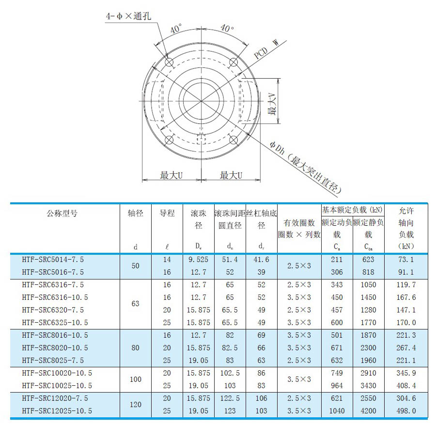 大負載驅動用HTF-SRC 型特點:高速傳送、靜音由于采用循環方式SRC,比HTF 型的傳送速度提高2 倍以上(d·n 界限值14 萬、16 萬),噪音水平降低8 ~ 10dB(1/2 ~ 1/3 的噪音)。精度等級、軸向間隙  標準精度等級、軸向Ct7,S:0.020mm 以下、N:0.050mm 以下。希望使用其他精度的請與NSK 協商。滾珠保持架S1采用在鋼球間加入樹脂制作的保持架S1 型號,大幅度提高了對于扭矩負載的耐久性。單側統一循環路徑配置的型號和為了提高負載容量改變回循環路數請與凡一商城或凡一導軌商城協商。設計上的注意事項:HTF-SRC 型是作為大負載驅動用,對螺母內的負載分布進行了均一化設計。為發揮這個特性。此外,在高負載和小沖程等嚴酷條件下使用滾珠絲杠時,依據使用條件由NSK 詳細分析。在設計絲杠軸軸端時如不將軸的一端鉆通、不將軸端尺寸設計為小于滾珠溝槽底徑,將無法組裝螺母,請留意。
